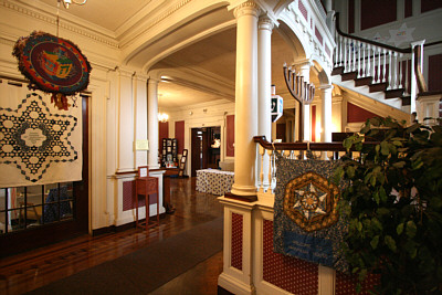 In 1890 many of Binghamton's wealthiest families lived in palatial mansions just west of the Chenango River on Riverside Drive. At that time four mansions lined the south side of the drive. The first was the residence of prominent industrialist Robert Rose, to the west were the homes of his brother Edward and Willis Sharpe Kilmer. The fourth residence, the one with bronze gargoyle lamps by the front door, was that of Jonas M. Kilmer, father of Willis and president of the Kilmer Swamp Root Company. Three of the mansions are long gone, but thank God (literally,) Jonas Kilmer's Mansion was spared when it was purchased in 1950 by Temple Concord for use as a synagogue. Shortly after the Kilmer estate was sold the Willis Kilmer and Edward Rose mansions were leveled and replaced by an apartment complex. The remaining Rose Mansion was demolished in 1980, this despite its designation as a National Historic Landmark and against strong opposition by the Binghamton community. A vacant overgrown lot is all that remains. The Kilmer mansions were designed by noted Binghamton architect C. Edward Vosbury. Born in Windsor, New York, Vosbury moved to Binghamton and designed residences for many of this area's wealthiest families. His designs are typically large and elaborate, sparing no expense on interior finish and detail. Other surviving examples of Vosbury's work locally are the Roberson Mansion on Front Street and the Binghamton and former Johnson City High Schools. A large, two and a half story stone structure, the Jonas Kilmer Mansion is distinctive with its variety of gables, turrets, balconies and towers. Constructed in 1898, the cost to build and furnish the residence was reported at the time to be one million dollars. Jonas came to Binghamton in 1881, invited by his brother Sylvester Andral Kilmer to run the patent medicine cure-all business that he founded. Jonas eventually bought Andral's share of the business and put his son, Willis Sharpe Kilmer, in charge of advertising. Sales picked up dramatically, the business experienced rapid growth, and the Kilmer family prospered. At one point the Kilmer estate extended south to the Susquehanna river, and about one mile to the west of the mansions. Following the purchase by Temple Concord the surviving mansion served as a synagogue, with services being held in what had been the ballroom on the third floor. By 1964 the congregation had outgrown the building and that year a new synagogue was built adjacent to the mansion. The two buildings were connected via the mansion's arched carriage porch located on the west side of the residence, an architectural feature known as "porte-cochere." In spite of the contemporary-style stone and glass addition, the structure and design integrity of the original porte-cochere was not compromised. With the addition of a new synagogue the mansion has continued to be used for religious classes and social events. It houses the Temple library and archives, and since 1996 has served as "Hanukkah House Museum," open to the public through December with displays of religious artwork and artifacts. Temple Concord vice president Neisen Luks commented: "We also sponsor periodic public concerts and art shows in the mansion, and depending upon availability it may be rented for special occasions." Luks went on to say that a mansion committee is considering other uses for the building, such as a permanent Jewish museum, a multi cultural resource center, an art museum, and a community wide cultural center among others. Today the 110-year old structure has changed little from its original design. Although the grand ballroom on the third floor has been partitioned into classrooms, the basic structure of the room was not altered. As listed on the National Register of Historic Places, "the Jonas Kilmer residence retains an exceptionally high level of integrity both inside and out, with almost all of its historic plan, finishes, and decoration intact." The building appears to be in great shape, but there is work to be done. "Structurally the building is in good condition," said Luks, however the roof needs to be replaced and a new heating and air conditioning system is needed. As a community resource, Luks hopes that local foundations and grant organizations will help fund necessary repairs. Inside, wood paneling, exposed beam ceilings, inlaid hardwood floors, marble fireplaces and decorative plasterwork are found throughout. A grand staircase dominates the west end of the main hall. Painted on the ceiling of the front parlor, a nineteenth-century oval mural is as spectacular today as it must have been when Jonas Kilmer entertained guests. Wooden racks once loaded with kegs and bottles still line the curved stone walls of the wine cellar. Up in the attic a massive mechanical contraption suspends an antique Otis elevator that hasn't moved in decades. From the outside a "Green Man" can be found below a window on the front of the mansion. Surrounding the base of the structure an assortment of lions and sea creatures serve as gargoyles, still directing rain water away from the walls. Well hidden in a small nook up under the eaves, a majestic gargoyle stands guard. With the body of a lion, a dragon head and wings, this menacing creature is so well concealed that building manager Ken Jones worked at the mansion for years before he noticed it. The two bronze light fixtures were never recovered, but a little-known fact is that they were part of a set of three figures. The third piece, a free standing hundred-pound bronze light fixture with matching winged dragon and a large leaded-glass globe, was removed from the front entrance immediately after the theft. For the last 12 years it has been stored in the basement. That is, until now. Last week the surviving bronze fixture was resurrected and is now proudly on display in the grand hall. A tour of the Hanukkah House Museum this Holiday season has something for everyone. For many it is a chance to see 