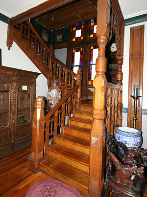 Repair and restoration is not new to Darrow, owner/operator of Parlor City Restorations. His restoration of the Jones house is a work in progress and definitely qualifies as a labor of love. So far Darrow's efforts have made an impressive difference. Intricate carved wood panels have been meticulously stripped and refinished, as have the wood floors and the magnificent oak staircase. A new roof put an end to the stairway waterfalls. Darrow's creativity and attention to detail is obvious. Pointing out the impressive brass work on the roof peak, Darrow commented, "I made that out of plumbing fixtures."