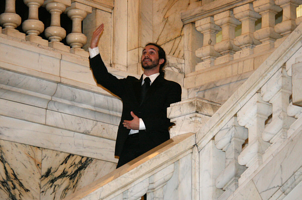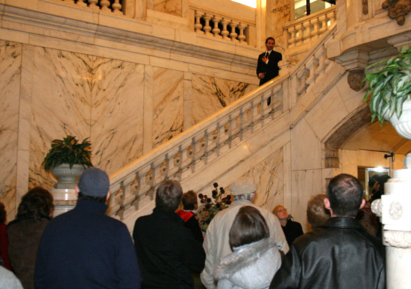 I am Truman I. Lacey. I came from Susquehanna , Pa. and moved to Binghamton in 1872 to work with Isaac Perry. Binghamton was experiencing rapid growth and my services were needed. Let’s look at one of my finest buildings, erected in 1904. Note the massive Romanesque arch at the entrance. I created this in the image of the company’s original emblem, a bridge spanning a river with a setting sun in the background. This design is echoed around the windows of the upper floors. Look into the magnificent ornate lobby with twin marble staircases. I am pleased that the company commissioned local artists to paint murals on the walls. |
