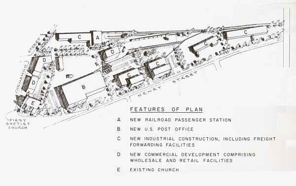 Proposed new railroad station, right, and Wholesale Distribution Facility