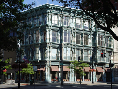Architecturally, it stands unique as this area's only cast iron building. When it was built, the technique of facing a masonry building with cast iron was not unheard of, it had been done in New York and other large cities. But this was a first for Binghamton and in fact was never to be repeated in the area. The symmetry and beauty of the Perry Building is so striking that it was featured in the 1991 movie "Liebestraum", a movie that also featured cameo appearances by a few of Perry's other works, including the "Castle" and Phelps Mansion. Although the blue color of the building with white and gold trim adds to it's distinctive appearance, Broome County Historian Gerald Smith tells us that wasn't always the case… in fact, the original color was tan with terra cotta trim.