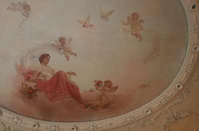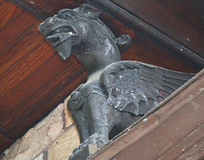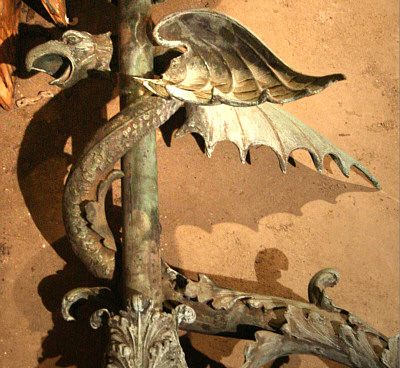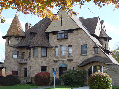 In 1890 many of Binghamton's wealthiest families lived in palatial mansions just west of the Chenango River on Riverside Drive. At that time four mansions lined the south side of the drive. The first was the residence of prominent industrialist Robert Rose, to the west were the homes of his brother Edward and Willis Sharpe Kilmer. The fourth residence, the one with bronze gargoyle lamps by the front door, was that of Jonas M. Kilmer, father of Willis and president of the Kilmer Swamp Root Company. Three of the mansions are long gone, but thank God (literally,) Jonas Kilmer's Mansion was spared when it was purchased in 1950 by Temple Concord for use as a synagogue. Shortly after the Kilmer estate was sold the Willis Kilmer and Edward Rose mansions were leveled and replaced by an apartment complex. The remaining Rose Mansion was demolished in 1980, this despite its designation as a National Historic Landmark and against strong opposition by the Binghamton community. A vacant overgrown lot is all that remains. The Kilmer mansions were designed by noted Binghamton architect C. Edward Vosbury. Born in Windsor, New York, Vosbury moved to Binghamton and designed residences for many of this area's wealthiest families. His designs are typically large and elaborate, sparing no expense on interior finish and detail. Other surviving examples of Vosbury's work locally are the Roberson Mansion on Front Street and the Binghamton and former Johnson City High Schools. A large, two and a half story stone structure, the Jonas Kilmer Mansion is distinctive with its variety of gables, turrets, balconies and towers. Constructed in 1898, the cost to build and furnish the residence was reported at the time to be one million dollars. Jonas came to Binghamton in 1881, invited by his brother Sylvester Andral Kilmer to run the patent medicine cure-all business that he founded. Jonas eventually bought Andral's share of the business and put his son, Willis Sharpe Kilmer, in charge of advertising. Sales picked up dramatically, the business experienced rapid growth, and the Kilmer family prospered. At one point the Kilmer estate extended south to the Susquehanna river, and about one mile to the west of the mansions. Following the purchase by Temple Concord the surviving mansion served as a synagogue, with services being held in what had been the ballroom on the third floor. By 1964 the congregation had outgrown the building and that year a new synagogue was built adjacent to the mansion. The two buildings were connected via the mansion's arched carriage porch located on the west side of the residence, an architectural feature known as "porte-cochere." In spite of the contemporary-style stone and glass addition, the structure and design integrity of the original porte-cochere was not compromised. With the addition of a new synagogue the mansion has continued to be used for religious classes and social events. It houses the Temple library and archives, and since 1996 has served as "Hanukkah House Museum," open to the public through December with displays of religious artwork and artifacts. Temple Concord vice president Neisen Luks commented: "We also sponsor periodic public concerts and art shows in the mansion, and depending upon availability it may be rented for special occasions." Luks went on to say that a mansion committee is considering other uses for the building, such as a permanent Jewish museum, a multi cultural resource center, an art museum, and a community wide cultural center among others. Today the 110-year old structure has changed little from its original design. Although the grand ballroom on the third floor has been partitioned into classrooms, the basic structure of the room was not altered. As listed on the National Register of Historic Places, "the Jonas Kilmer residence retains an exceptionally high level of integrity both inside and out, with almost all of its historic plan, finishes, and decoration intact." The building appears to be in great shape, but there is work to be done. "Structurally the building is in good condition," said Luks, however the roof needs to be replaced and a new heating and air conditioning system is needed. As a community resource, Luks hopes that local foundations and grant organizations will help fund necessary repairs. Inside, wood paneling, exposed beam ceilings, inlaid hardwood floors, marble fireplaces and decorative plasterwork are found throughout. A grand staircase dominates the west end of the main hall. Painted on the ceiling of the front parlor, a nineteenth-century oval mural is as spectacular today as it must have been when Jonas Kilmer entertained guests. Wooden racks once loaded with kegs and bottles still line the curved stone walls of the wine cellar. Up in the attic a massive mechanical contraption suspends an antique Otis elevator that hasn't moved in decades. From the outside a "Green Man" can be found below a window on the front of the mansion. Surrounding the base of the structure an assortment of lions and sea creatures serve as gargoyles, still directing rain water away from the walls. Well hidden in a small nook up under the eaves, a majestic gargoyle stands guard. With the body of a lion, a dragon head and wings, this menacing creature is so well concealed that building manager Ken Jones worked at the mansion for years before he noticed it. The two bronze light fixtures were never recovered, but a little-known fact is that they were part of a set of three figures. The third piece, a free standing hundred-pound bronze light fixture with matching winged dragon and a large leaded-glass globe, was removed from the front entrance immediately after the theft. For the last 12 years it has been stored in the basement. That is, until now. Last week the surviving bronze fixture was resurrected and is now proudly on display in the grand hall. A tour of the Hanukkah House Museum this Holiday season has something for everyone. For many it is a chance to see 