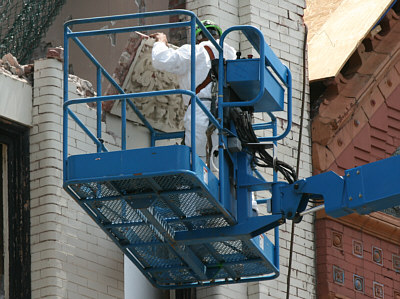 But then it happened - when the demolition was nearly complete, something extraordinarily "green" took place. With all but two of the 100-year-old terracotta Green Men destroyed, demolition came to a halt, the crane fell silent. A sole worker dressed in full hazmat attire, climbed into a lift bucket and was raised four stories to the remaining figures. Once in place, he worked with a crowbar for half an hour, prying, chipping, and finally, and very carefully, lifting each of the precious artworks into the bucket. Back on solid ground, the demolition resumed.