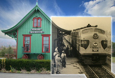 I guess it's serendipity. Recently on a late afternoon I pulled off the Parkway in Vestal to make a phone call. Intent on the conversation it wasn't until I hung up that a change in weather became evident. Spanning the eastern sky was a magnificent rainbow - and centered beneath like a bright emerald jewel was the Vestal train station. There's a saying: "It takes both sunshine and rain to make a rainbow." The old Vestal station has seen its share of both, and today, as a restored and functioning historic landmark it stands as one of Vestal's most prominent and recognizable icons.