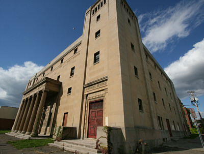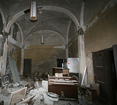 The ceremony was filled with ritual and symbolism. The "Great Architect of the Universe" was invoked and a cornerstone was placed in position. Tools of the craft were used in the ceremony: the square, the level and the plumb, each an implement of Masonry, and each representing moral attributes as well. Corn, wine and oil were poured on the stone signifying bounty, joy and peace. As in the original ceremony, on completion of each segment the Masons concluded that the craftsmen had done their job well, then in unison chanted "so mote it be," meaning "so it is." For those fortunate enough to witness the event, it was a solemn, moving and truly unforgettable experience. Established over 600 years ago, Freemasonry is claimed to be the oldest fraternal organization in the world. It first appeared in this area in 1798, the Grand Master was John Patterson and meetings were held in Joshua Whitney's log cabin. As the organization grew, meetings were held in several buildings around town. In 1898 a Masonic Temple was built on Chenango Street which served as headquarters until it was destroyed by fire in 1919. Finally, in 1922 a new Masonic Temple was constructed on the corner of Main and Murray Streets. Designed by Walter H. Whitlock and Charles H. Conrad, the building, with its classical six-column portico has elements of "Art Moderne" style. Inside was a large theater, two lodge rooms were located on the second floor, upper floors held recreational rooms and a grand ballroom. In later years the theater was rented out for concerts, Broadway performances and other events. Dances were held in the ballroom. During the 1960's and 1970's it was home to the Tri-Cities Opera and Summer Savoyards. Local musician Eric Ross remembers seeing opera great Placido Domingo in a Tri-Cities Opera production at the Masonic Temple. With declining Masonic membership, in the mid 1980's a plan was developed to renovate the upper floors into apartments for senior housing. Construction began and was well under way when, in 1990, funding came to a halt and the project was abruptly abandoned. Shortly after that the Masons moved out and in December of 2000 the building was sold at auction. Former Mayor Richard Bucci announced at the time that the new owner, a development group in Sarasota, Florida, which also owned the Grand Royale Hotel and the Drazen Building on State Street, planned to convert the Masonic Temple into student housing. In 2001 Binghamton University Administration announced that the student housing plan was in its final stages, stating that the building "was already separated into apartments 10 years ago," and it "has a common area large enough to fit a basketball court." It was not to be. Owner of the building David Band recalls that after the sale some structural work was done, the roof was repaired and the building was secured. "Then the economy turned and the project was put on hold," he said. Now he is interested in selling the property. Today the grand entrance and the theater are filled with debris: piles of wooden seats, cabinets, construction material, pianos, toilets, an organ console… everything but the kitchen sink. Make that everything INCLUDING the kitchen sink - at least three of them can be found in the rubble. In the pitch black theater a flashlight shows walls that are stripped bare, the stage that once supported lavish operatic productions is littered with trash. This grand hall, once filled with music, laughter and applause, is cold, dark and silent. The upper floors look like a work in progress. Walls have been demolished, new walls have been erected, electrical and plumbing work is unfinished. New windows are in place, bathtubs have been framed in. Piles of lumber and drywall sit waiting for workers to return - workers that left the job nearly twenty years ago. Copper plumbing has been removed, presumably by vandals. In the catacombs beneath the auditorium a ladder stands below an open window making for easy access by nocturnal visitors. Other than some architectural detail in the theater, there is little evidence of the building's original Masonic use. But on the top floor, in the midst of partially completed housing units, the old "Doric Room" remains somewhat intact. With its arched ceiling, a stage at one end and elevated seating along each side, the Doric Room was used for Masonic meetings and ceremonial events. I left the Masonic Temple with a few impressions. The building is a magnificent structure. It has a rich history and for 70 years provided a great service to this community. Today, the interior is a mess. With no climate control, 18 years of exposure to the elements has taken its toll. But the building itself appears to be structurally sound. Outside I went to the northeast corner of the building to look for the cornerstone. There it was, engraved with a date and name of the Masonic Grand Master. On July 22, 1922, a ceremony took place at that very spot. The Great Architect of the Universe was invoked and the cornerstone was placed. It was positioned by square, level and plumb. It was sprinkled with corn, wine and oil. Today, in spite of years of neglect the building stands strong and proud, ready for its next use. The craftsmen did their job well. So mote it be.