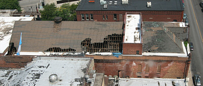 A gentle rain was falling as I entered the back door of the Stone Opera House. Once inside it seemed unusually bright, but stranger yet, it was raining inside as well! Overhead gray sky could be seen through a matrix of wooden rafters and steel beams. A large part of the roof was gone! Sure, the roof has been in bad shape for years, in fact not long ago the City took the building's owner to court in an attempt to force needed repair. But how could it have deteriorated this much over just the last few days? Maybe it was the wind, or worse … demolition. Like the Ross Building last year, is yet another piece of Binghamton history about to be, well… history? None of the above… in fact, the deteriorating and long neglected roof is being repaired, and we're not talking tarps and temporary patches. Contractor Gary Rittenburg was hired by the building's owner to do the job. "The owner told me: 'do it like it was your own building'," said Rittenburg. The city requires the building to be "weather tight." Rittenburg feels that the holes in the roof could be patched to meet that requirement, but it's only a matter of time before other areas would fail. So the decision was made to replace the entire roof. "I've worked with the owner for some time. He trusts me to do the job right," said Rittenburg. Binghamton Vacant Properties Officer Keith Heron checks for daily progress on the project. "The City is delighted over the progress that's being made," said Heron. He commented that the City, the Department of Code Enforcement and the owner are all working together to make this project a success. In addition, the Commission on Architecture and Urban Design (CAUD) and the Preservation Association of the Southern Tier (PAST) are kept informed and consulted on design and preservation issues related to the project. For instance, the contractor is proposing a new metal roof - lighter, more durable and more cost effective than duplicating the original. Because it would deviate from the original design, the proposal went before CAUD for approval. Binghamton's Historic Preservation Planner H. Peter L'Orange commented that approval was granted with conditions: the new roof must be of neutral color, drainage systems must ensure no water damage to the building or surrounding buildings, and the metal roof is to be replaced with a more appropriate roof "at a future, undetermined date in conjunction with long-term plans to rehab the building as a whole."