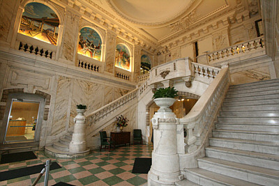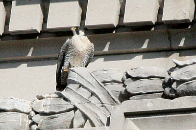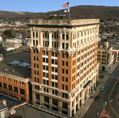 Eric was just one of several Peregrine Falcons that over the years have called the Security Mutual building home. Artist and naturalist John Baumlin has studied the species extensively since they first appeared at the site in 1996. As Baumlin points out, "Peregrines normally nest on cliffs, and a tall building can satisfy their needs in the same way." But the Security Mutual is not just any "tall building." Designed by Truman I. Lacey and son, this Binghamton "skyscraper" was built in 1904 to be the headquarters of the rapidly growing Security Mutual Life Insurance Company. It was a banner year for construction in Binghamton. Next door the Carnegie Library was just completed. The Press Building on Chenango Street was also built that year and consistent with the competitive nature of its owner, Willis Sharpe Kilmer, that structure was to rise 29 feet higher than the Security Mutual building. Security Mutual stands as an elaborate expression of Beaux-Arts Classical architecture. The massive arch at the entrance was created in the image of the company's original emblem - a stone bridge spanning a river with a setting sun in the background. Originally, a radiating pattern of ironwork filled the upper portion of the arch further emphasizing the concept. The design is echoed around the windows of the upper floors where carved stone lion heads look out over the city. Inside, the highly ornate two-story lobby is one of the most magnificent in the area. Finished in Pavonezza and Carrerra marble, the grand entrance features twin marble staircases that curve gracefully to the second floor. The domed ceiling is framed by architectural features and high above the entrance a marble sculpture of a hunting dog watches over the lobby. Some say it's the architect's dog, others believe it to be the family dog of the first company president, and although not quite as romantic, there is some indication that it simply exists as a symbol of fidelity for the insurance company. The walls on each side of the lobby are faced with arches, where in 1983 the company commissioned local artists to paint murals depicting life in Broome County. Magnificent woodwork, ornate fireplaces, vintage light fixtures, and even the original conference room table are found in the executive offices on the upper floors. A close look at the doorknobs reveals an intricate Security Mutual logo molded into the brass fixtures. Updates and modifications have been made as technology and requirements have changed over the years, but where possible, original design elements have been maintained. Nowhere is the dichotomy more evident than in the mail handling system. Antique 19th-century mail chutes are found next to the elevators, where a 21st-century robot silently roams the aisles delivering inter-office mail. No stranger to high technology, in 1969 the company erected a new sign on top of the building spelling out "Security Mutual Life," and long-time residents recall looking at the sign to get the latest weather forecast. Each day for the next four years telephone calls were made to the weather bureau, then neon lights in the initial letters, S, M and L, were switched on to indicate the forecast - green letters meant clear skies, gold indicated cloudy conditions, flashing gold meant a storm was brewing, and when they were white, snow was on the way. It was a hot summer day in 1991, when across the street patrons of Windsor Tavern heard a loud bang. As reported in the Binghamton Press, "soon afterward a woman ran into the bar screaming, 'My God, the building is falling!'" The article continued: "More than 600 pounds of concrete fell off the Security Mutual building and crashed onto a Court Street sidewalk." Luckily no one was injured when a chunk of decorative façade fell from the northeast corner of the building, but the event sparked an effort to better monitor the condition, not just of this building, but all of Binghamton's aging structures. Binghamton is rich in historic, architectural, and natural treasures. This building embodies all three - it is rich in history, an architectural masterpiece, and it provides security for some of this area's most fascinating wildlife. It also holds a distinction that very few commercial structures can claim. Since the day it was completed over a century ago the building has been continuously owned and occupied by its builder, Security Mutual, and continuously occupied by its first tenant, a law firm that would later be known as Hinman, Howard and Kattell. As stated in the company brochure, "the building stands today as a symbol of the strength and stability of Security Mutual Life." In 1986, on the occasion of its 100th anniversary, Security Mutual adopted a tag line: "Building on a Century of Service." How remarkable, that it is still being done from a building with a century of service.