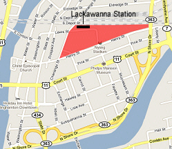 The basement of the station holds hidden treasure. Since 1984, storage space has been provided to the Susquehanna Valley Chapter of the National Railway Historical Society for their collection of railroad artifacts. President John Goodnough takes every opportunity to exhibit the collection in area museums, a collection that begs to be moved upstairs and put on permanent display in Lackawanna Station. Since its rebirth in 1984, Lackawanna Station has served the community well. But it almost didn’t happen. Looking back, one wonders just how the building survived the urban renewal axe in the 1960’s. Cost may have been a factor. In 1968 the city reported that after seven years and many millions of dollars, “plans for the buildings that would give the city its new look, and hopefully, its new vitality, were still on the drawing boards,” and “costs had run far above estimates.” But it’s tempting to think the plan was cut short due to community response. In fact, as early as 1962 there was concern about the systematic destruction and inappropriate construction associated with urban renewal in Binghamton. Two years later the Commission on Architecture and Urban Design (CAUD) was formed to help ensure that proposed changes were appropriate and would not compromise the character of the city. As for the Project #2 area, today a parking lot fills the space where the majestic Arlington Hotel once stood. Scores of small businesses and homes are history… replaced by more parking lots, a sprawling post office complex and baseball stadium. The retail store is long gone, manufacturing facilities were never built, and First Baptist Church, the only structure to be preserved by the plan, was razed by its owner in 1970 and replaced with senior housing. Meanwhile, Lackawanna Station, nearly demolished 45 years ago by urban renewal, and again more recently by neglect, is the only original structure still standing. When asked if he has advice for a potential buyer, current station owner Meisel commented: “Buy it because you love it.” That is precisely what happened 26 years ago, and because of that buyer’s passion, vision and perseverance, this community can be grateful that “come hell or high water, he accomplished what he set out to do.”