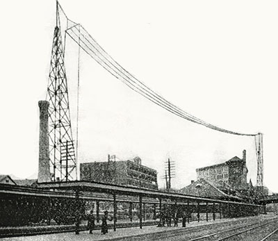 Over the next few days more tests were conducted, equipment was fine-tuned, and improvements were made. Finally on November 27, the first “official” announcement was made of wireless communication with a moving train. It was 1895 when Guglielmo Marconi invented a practical method for wireless telegraphy. As he described the process to a reporter, “It is the Morse code… for one dot, a single spark jumps; for one dash, there comes a stream of sparks. Each spark indicates a certain oscillating impulse from the electrical battery that actuates the coil; each one of these impulses shoots through the wire, and from the antenna through space by oscillations of the ether, travelling at the speed of light. That is all there is in the sending of these Marconi messages.” By 1913 Marconi wireless systems had been successfully used in a variety of applications, one of the most effective being ship-to-shore communications. Just one year before the Binghamton experiment it was a Marconi system that transmitted “SOS… TITANIC SINKING, PLEASE RUSH ALL POSSIBLE ASSISTANCE, RUSH, RUSH.” Now there was a growing need to communicate with fast-moving trains but at that time it was doubtful that it could be done. Transmitting to a slow-moving ship with a high antenna over an unobstructed span of water was one thing, transmitting to a high-speed train with a low antenna through mountainous terrain posed serious challenges.