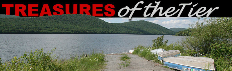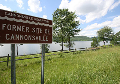 Not far from Benjamin Cannon’s homestead, water enters a tunnel to begin a 120-mile journey, eventually combining with water from other reservoirs and ultimately passing below the Hudson River before reaching kitchen faucets in the Big Apple. Cannonsville is just one of five small hamlets eliminated by the reservoir, others being Rockroyal, Granton, Rock Rift, and Beerston. Nearly 20,000 acres of land were taken for the Cannonsville Reservoir project. 941 residents were displaced and 2,150 graves from eleven cemeteries were relocated to a variety of cemeteries in the region. Founder Benjamin Cannon’s remains were reinterred in the Pepacton Cemetery, 40 miles from his home and original gravesite. In 2007 Zandt published a book about the experience. Titled “Memories,” the book is a compilation of photographs, articles and recollections of former residents forced to leave their homes. The area still harbors strong feelings about New York City and The Taking. “We have no use for them,” Zandt said, speaking of those who took possession of their property and flooded their homeland. “They were not nice people,” she said. “Even though the farmers in these communities all banded together, they were no match for [the City].” A few structures survived the project and can be seen today. The war memorial was relocated to Speedwell Mountain above the water line overlooking the spot where Cannonsville lies submerged. The 1850 covered bridge was removed to Unadilla, then after reconstruction following a fire it was moved to its current home in Old Mill Village, New Millford, Pennsylvania. A few of the newer homes were relocated prior to flooding the valley, said Zandt, who remembers standing guard in her home until the day it was hauled to its new location in a nearby town. Annual reunions of residents displaced by the reservoir have been held for decades. Zandt said the early events attracted nearly 500 people but the number has gone down over the years. This year she expects one hundred to attend when the reunion takes place July 28 at the Firemen’s Pavilion in Deposit. Today, nine miles east of Deposit on State Route 10 the setting is that of a picture postcard. Eagles soar in thermals overhead, forested mountains and foothills stretch as far as the eye can see, and a placid 16-mile-long lake mirrors the blue sky. A handful of small non-motorized rowboats can be seen on the water where fishermen experience the quiet pleasures of this pristine treasure in the Catskills. There is nothing to indicate that this picturesque scene is anything other than pure, unadulterated nature. There are no clues to what lies 75 feet below the rowboats in dark submerged silence – roads untraveled for half a century, stone outlines of 200-year-old homesteads – of the Community House, Peg’s Tavern, and scores of other former structures. Below the rowboats once-sacred sites lie dormant, long since stripped of graves and headstones. A twin-arch steel bridge leads to a sunken ghost town where nine generations of residents lived and worked, and before that, unknown generations of American Indians called the confluence of these rivers home. Truth be known, there is one clue to the existence of this secret world that can still be found. It is a road that branches off State Route 10 to the west. That same road that led to Cannonsville fifty years ago is still there, but now it slips beneath the gentle waves and quickly disappears from sight. Watch for it when driving up Route 10, but when you come to the fork in the road, do not, as the saying goes, “TAKE IT.” The City of New York already did.