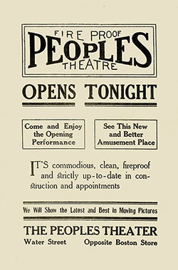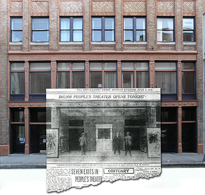 Six years earlier when the theater was built, concerns about fire could not have been greater. On July 22, 1913, just six weeks before construction of the People’s Theatre began and only one block away, fire broke out at the Binghamton Clothing Company claiming 31 lives – an event that remains to this day the worst loss-of-life tragedy in Binghamton history. Following that event, there was a new emphasis on fire safety in building construction. It has been said that from every tragedy, something good comes. In fact, this building stands today because of lessons learned from the Binghamton Clothing Company fire. In 1913 A.W. Newman operated a jewelry store on Chenango Street. That summer there were four theaters featuring vaudeville and motion picture entertainment in Binghamton, and Newman saw a need for a new, more intimate venue. He decided to close his shop and have a theater built – a place where people could gather for evenings of fun and entertainment. It would be called the People’s Theatre. Albert Willey was contracted to build a five-story building to house Newman’s 400-seat theater. Technically, it would be known as the Willey Block, but this was definitely the people’s building. Built of reinforced concrete it was promoted as an “absolutely fireproof photoplay house” and “one of the most modern structures of its character in the country.” Ground was broken on September 11, 1913, and on the following July 6, the People’s Theatre opened to a packed house.
