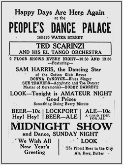 The theater was an immediate success and continued to thrive for several years. Then in the late 1920’s, with the advent of sound in motion pictures, the silent film era came to an end. For reasons unknown, the People’s Theatre held fast in its resistance to the new technology, and by the end of the decade attendance had declined to a point where the theater could no longer continue to operate. It was then that manager Jesse Hilman saw an opportunity. After the Saturday evening performance on September 27, 1930, the theater closed. Hilman announced that “the front and the rear of the theater will be removed as well as the seats, furniture and fixtures used for movie purposes.” A sale was advertised – theater seats sold for twenty-five cents each, movie projectors went for $75 and the locally-made Link automatic piano and $3,000 Link theater organ each sold for $50. Once the space was cleared, construction of Hilman’s vision was underway, and within two weeks an indoor 18-hole miniature golf course would open for business. As Hilman proclaimed, “it will be the last word in miniature golf construction.” Actually, next-to-last word might have been more appropriate – the last word would come two years later when Binghamton’s fascination with indoor golf suddenly bottomed out. Once again the doors closed, the golf enterprise was declared a total loss, and Hilman was bankrupt. Miniature golf was out, but with the end of prohibition, beer was in. An advertisement in December 1933, proclaimed “Happy days are here again at The People’s Dance Palace,” serving “the finest beer in the city.” Later known as Peoples Palace, and then Peoples Restaurant, the nightclub finally closed in 1938 bringing an end to entertainment in the People’s Building. After that the space was occupied by a variety of commercial businesses, and for many years the Drybak Corporation continued its manufacturing operations on the upper floors. Starting in 1963 an audio supply shop occupied the lower level and remained for over two decades. It was during that time that the fireproof Willey Block would be put to the test one more time. In the summer of 1968 during a hot evening simmering with racial unrest, wooden boards covering a broken window were set on fire and a Molotov Cocktail fire bomb was thrown at the building. Once again the building survived with virtually no damage. Over recent years the first floor sat empty until 2012, when it reopened as a brew pub and restaurant known as the Water Street Brewing Company. Today the outside of the building looks much as it did when it first opened a century ago. Marquee lights still line a cast iron façade and frame the lower level, where the original center entrance and ticket booth have long since been replaced by windows. Inside, large stainless steel brewing tanks, a bar and dining tables fill the old theater space where once again people enjoy “the finest beers in the city.” Interestingly, the original sloping theater floor lies hidden in darkness below the current floor, where it is surrounded by faded wall murals that once provided outdoor ambiance for indoor golfers. It has been a long time coming, but the People’s Building is once again living up to its name. The People are back, and just in time for its 100th anniversary.