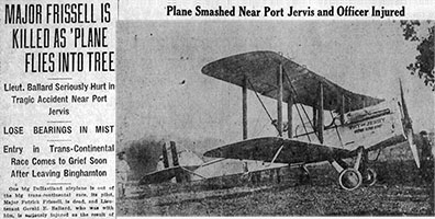 It was summer, 1919. The World War was over and the influenza pandemic had passed. People danced the shimmy to jazz band music at the Arlington, one-piece bathing suits were spotted at Ideal Park – and the airplane had come to town. The idea of sending mail by air was in the news, cross-country flights were occasionally reported and daily commutes by air to the office were seriously envisioned, even to include futuristic spiral landing platforms on the roofs of office buildings. But there was a problem – flying machines were not safe. They frequently crashed, flipped over on landing, ran into things and burst into flames. One popular model, the DH4 Liberty Plane, due to frequent fuel tank fires had earned the nickname “Flaming Coffin.” In an attempt to demonstrate that airplanes could travel safely over long distances, the U.S. Army decided to hold a transcontinental air race. Starting October 8, airplanes would take off from Roosevelt Field on Long Island, fly to the west coast and return. The 5,200-mile round trip would include 20 compulsory stops in each direction. Binghamton was to be the first stop heading west and the last stop on the return before finishing at Long Island. Simultaneously, a few flights were to follow the reverse route, starting on the west coast and flying to the east and back. An open field along the Chenango River at the old Conklin farm – where Otsiningo Park is today – had been used as an airfield, and in anticipation of the transcontinental race, the Binghamton Chamber of Commerce announced that the Conklin Farm airfield would be prepared for “the greatest airplane race ever attempted.” But the Conklin airfield had some rough spots and had not been confirmed as a stop on the race, plus there would be unexpected competition. That summer the Endicott-Johnson Corporation was experiencing major growth. New factories and more workers were needed to double current production. In response, the company purchased 1,000 acres of land west of Union and Endicott, to be known as West Endicott. New factories were planned, as well as housing for 10,000 additional employees – and to accommodate anticipated air commutes to and from Binghamton, an airfield was prepared at a spot known as Laroquette Flats, approximately where Our Lady of Good Council Church is now located, not far from today’s Tri-Cities Airport. As it turned out, the West Endicott field was selected to be the Binghamton control point on the transcontinental route. On October 5 a large DeHaviland biplane with two army pilots landed at the field, checked into Hotel Frederick and the next morning went to work. As reported in The Morning Sun, the two officers “will take formal supervision in behalf of the government of the West Endicott flying field in order to whip it into shape as one of the chief control stations in the great ocean-to-ocean reliability ‘Sky Line Derby’.”