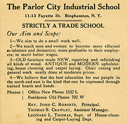 THE FIRST BLACK SCHOOLS Prior to 1861 a “school for colored children” was located near Carroll and Fayette streets. The school did not have a dedicated teacher and was not under supervision of the Board of Education. Then in 1861 a small house on Hawley Street was set up as another school. It continued to serve the African-American community for eleven years, and it is interesting to note that Amelia Loguen, daughter of abolitionist Reverend Jermain W. Loguen, and renowned educator and activist Edmonia Highgate, both served as teachers at this school. Finally in 1872, African-American pupils were assigned to general public schools. By the end of the 19th century basic education was provided but more was needed. Employment opportunities for African-Americans at this time were extremely limited, and Reverend John Roberts, pastor of the AME Zion Church, saw a need for practical trade-school education. In 1910, Roberts, along with two other officers of the church, Thomas Crawley and Leonard Thomas, established the “Parlor City Industrial School.” First meetings were held at the church, then in 1911 the school moved to a building at Fayette Street. The advertised goal of the school was “to teach men and women to become more efficient as laborers and domestics.” Instruction was provided for furniture repair, upholstering and house cleaning. Around that same time, Fred Hazel came to Binghamton. Having graduated from an industrial school in Virginia, Hazel saw a need to provide similar schooling, job training and job placement for the local Black community. In 1912 he founded the “Binghamton Normal Industrial and Agricultural Institute.” Like the Parlor City school, meetings were first held at AME Zion Church. Hazel then obtained 105 acres of land adjacent to Ross Park, where cottages, classrooms and a chapel were built. Female students were trained in sewing and domestic service, and male students in painting, upholstering and carpentry. The Normal Institute continued to operate for three years, but ultimately closed due to lack of funds. The Parlor City Industrial School moved to State Street in the 1920s and later became known as the “Industrial Furniture Company,” which continued to operate into the 1960s.